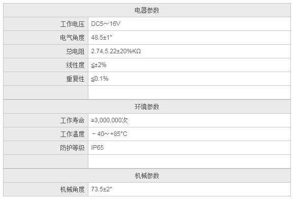 电子油门踏板位置传感器 •工作电压:DC5V~16V •电气角度:48.5°±1° •总阻值:2.74,5.22±20%ΚΩ •线性度:≤±2% •工作温度:-40~+85℃ •防护等级:IP65 •可带开关信号 •电磁干扰屏蔽,冗余设计,可靠性高 •高精度导电塑料电位计,性能稳定,分辨率高 •流线型外形,美观大方 •结构组件为纤维增强型塑料,可用于在恶劣条件下工作的车型